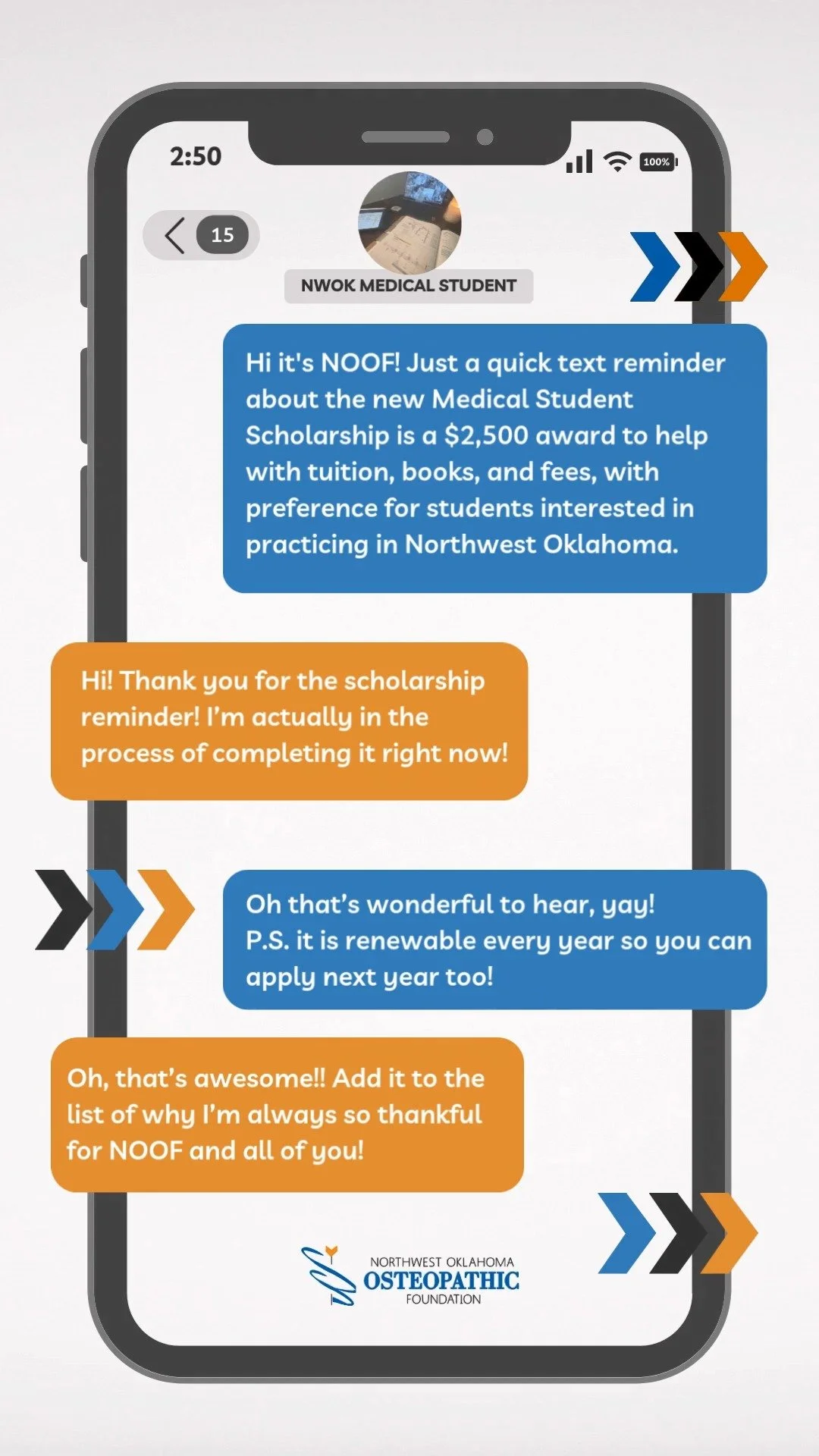 The Northwest Oklahoma Osteopathic Foundation (NOOF) is a 501(c)(3) 509(a) (1) nonprofit private foundation dedicated to enhancing healthcare in Northwest Oklahoma and empowering the next generation of medical professionals. Our goal is to ensure that aspiring physicians are not only prepared to succeed but also inspired to serve the communities of Northwest Oklahoma.
